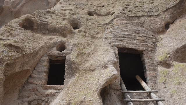 It was a pretty amazing day. When we finally dragged our sorry posteriors out of the rack and had a latte, we were off on the bike for the first time in three days to Bandelier National Monument, 33,000 acres of land once inhabited by ancient Indigenous tribes where villas remain built of adobe houses and cliff dwellings. Back when Nan and I first conceived of this trip, (in its original form) we were each recording our top ten things to see and this made both our top ten lists. It was a fascinating visit. At least 23 tribal nations had lived in the Frijoles Valley a thousand years to 400 years ago, until they were driven away by drought to the Rio Grande. While there were none of the original adobe huts remaining, some "recreations" built on the foundations of the originals were there, constructed in the early 1900s when the valley was originally excavated. However, there were many of the original cliff homes still evident. Archeologists have found evidence of 3,000 individual "villages" which may have had as few as two families or 40. Not all were necessarily occupied at the same time.